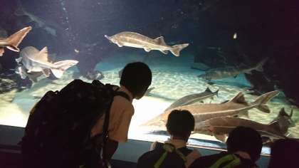 チョウザメに見いる子どもたち。中にはこれの卵がキャビアやでと豆知識を披露する子も。