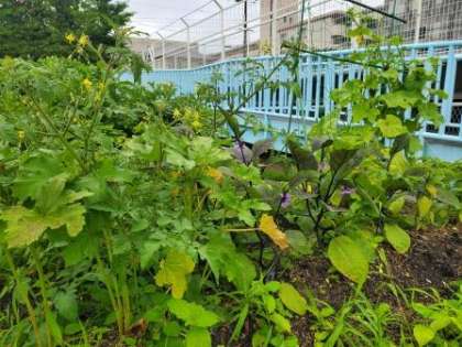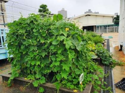 ご覧いただいている写真は、プール前に設けられた学習園の様子です。なすや枝豆、へちまやじゃがいもなど、学年ごとに様々な種類の植物を育てています。雨に濡れた緑が色鮮やかに輝いていてとてもきれいです。