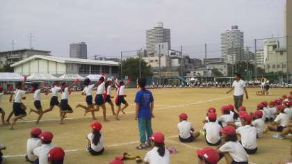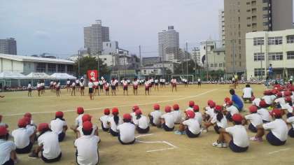 応援合戦では、赤組白組に分かれ、応援団の児童の演技に合わせて手拍子やウウェーブを練習しました。