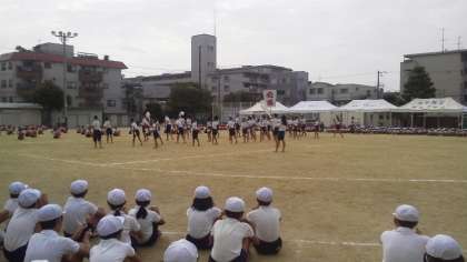 今日の全体練習は、最後の演技「体ほぐしの体操」、閉会式、校歌斉唱、応援合戦に取り組みました。