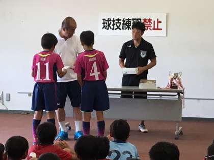 写真はサッカーの試合と表彰式の様子です。高倉FCは見事に決勝戦まで勝ち進み、あと一つ勝てば優勝だったのですが、決勝戦を前に暑さ指数が危険を超えたため、決勝戦はPK戦となってしまいました。