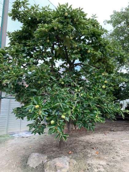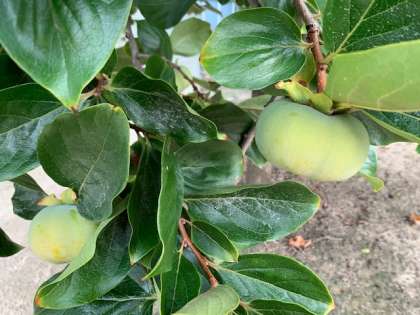 高倉小学校には実をつけるさまざまな植物が植わっています。その中でもプール横の築山付近にある柿の木を紹介します。