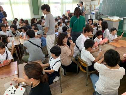 写真は上から、1年「トランプあそび」、2年「みんなで協力してつなげよう伝言ゲーム」、3年「工作」の活動の様子です。