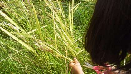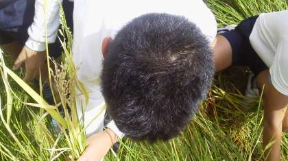 クラスごとに、はさみを使って、丁寧に稲を刈りとっていました。