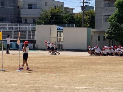 また、2年生は徒競走の練習を行っています。スタートの合図で力強くダッシュして、全力でゴールに向かって走っています。子どもたちのがんばりが輝いていました。