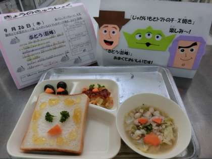 ☆ 今日は残暑が厳しく、あと4日後にせまった運動会の練習で疲れた身体に、甘い巨峰ぶどうやじゃがいもとトマトのチーズ焼き等で元気アップした給食タイムとなりました!