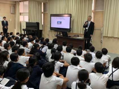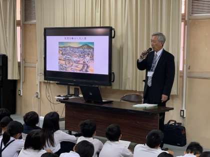 講話では戦時中の児童の生活の様子がわかるように、本校の学童疎開の様子を記した「連結器の上で」を紹介していただきました。疎開先での生活や、大阪大空襲で保護者を亡くした児童に対して大阪への帰路に列車内で教員が語りかける様子など、当時の児童や教職員の苦労や戦争の理不尽さがよく伝わりました。