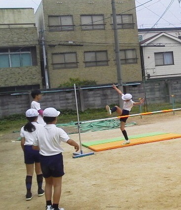3,4年生の体育では、小型ハードルを調子よく跳んだり、高跳びでは短い助走から踏み切って跳んだりできるよう学習を進めています。