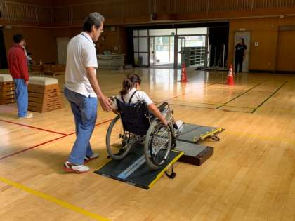 まず、車いすの仕組みや使い方を教えていただいた後、グループで交代しながら講堂内を車いすに乗って移動しました。Uターンするところや段差があるところの車いすの操作が難しくて、苦労していた子もいましたが、友達と助け合いながら克服していきました。その後、校内の廊下に出て学んだことを活かしながら車いすを操作しました。