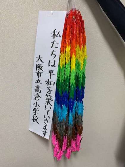 そして、今回の学習の取組みの一つとして、子ども達は平和への願いを込めて千羽鶴を折りました。千羽鶴は明日広島平和記念公園内の原爆の子の像に捧げられます。