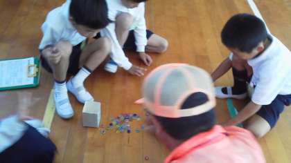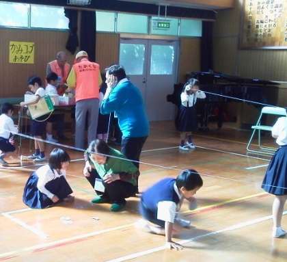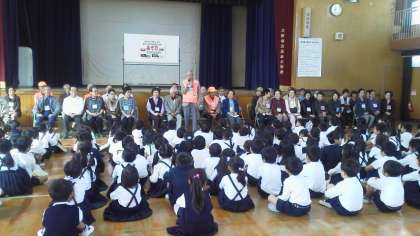 10月24日(金)1年生が高倉地域の老人会のみなさんと遊びの交流をさせていただきました。1年生は、会場の講堂で、老人会の皆さんの到着を拍手で出迎え、元気よくあいさつしました。参加していただいた48人の皆様は、オレンジ隊などで子どもたちを見守っていただいている方々も多く、「この日を楽しみにしていました」とのうれしいお言葉もいただきました。