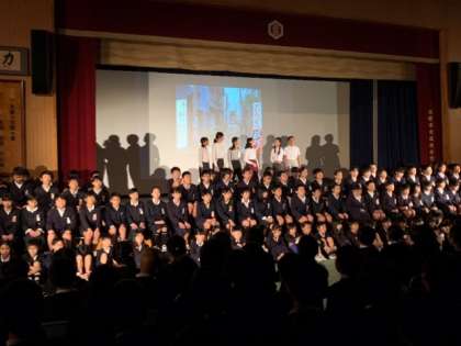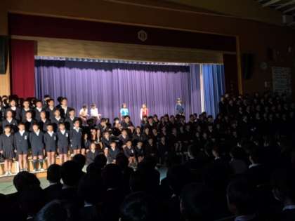 写真は上から、5年生「銀河鉄道の夜」、6年生「いのちのバトン」の発表の様子です。