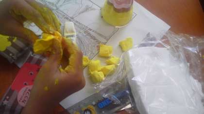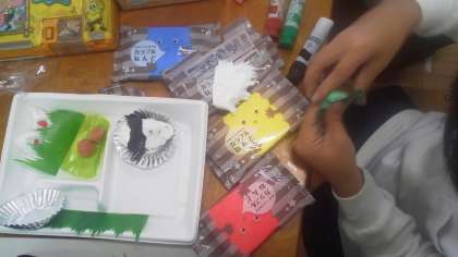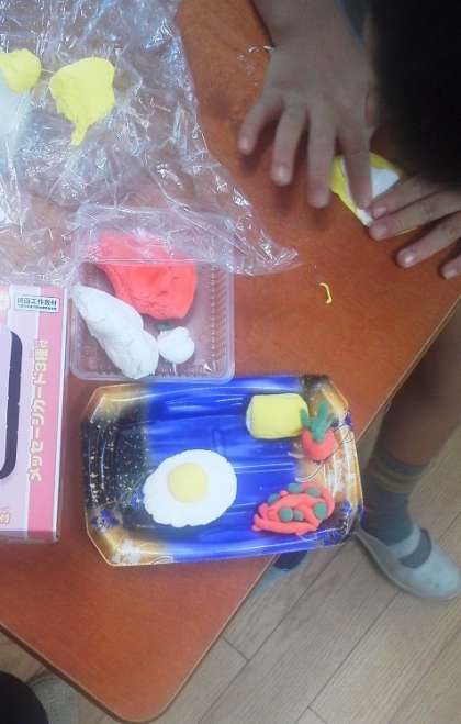 2年生が紙粘土でおにぎりやおかずを作りお弁当箱にもりつけ、お弁当作りに挑戦しています。紙粘土は赤青黄色のものもありますが、絵具で自分の欲しい色を作って粘土に混ぜ込み使うこともできるそうです。どの子も真剣に、そしてとっても楽しそうにお弁当作りに挑戦していました。