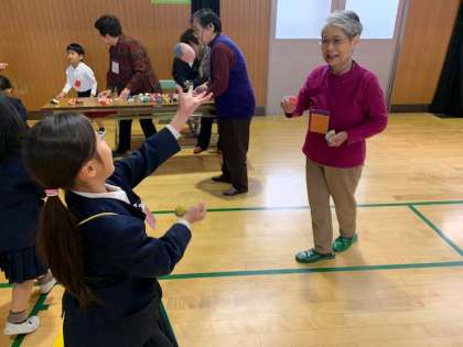 写真は、「かみずもう」「おはじき」「おてだま」の様子です。「おてだま」は地域の方が子どもたちのために特別に作ってくださいました。