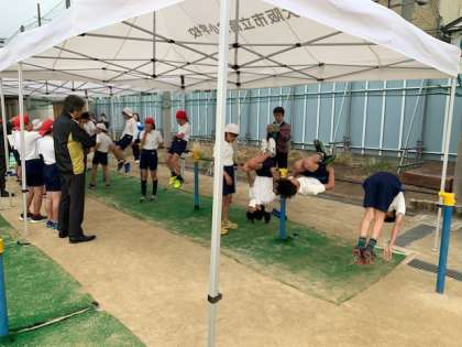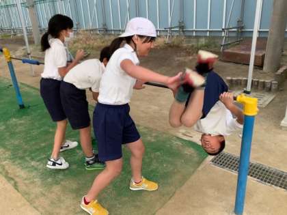 11月28日(木)の6時間目に5年生が授業研究会で鉄棒運動の授業を行いました。