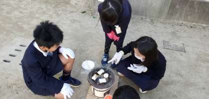 今日、3年生が社会の学習の一環として、昔の道具である七輪を使ってお餅を焼く体験をしました。管理作業員の石川さん、東村さんにお手伝いをしてもらいながら、どのクラスも上手に焼くことができました。