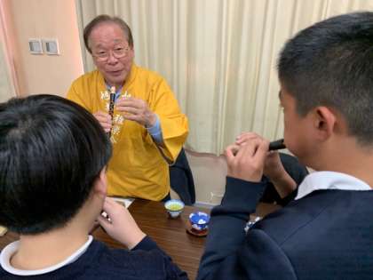 雅楽の特別授業の最後には、演奏した楽器を実際に体験する学習もありました。時間の関係で、各学級から代表に選ばれた児童が、楽器の扱い方を教えていただきチャレンジしました。楽器の持ち方、息の入れ方など、苦戦していた子どもたちでしたが、音が出たときはとってもうれしそうでした。