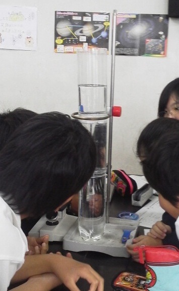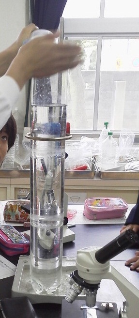 ペットボトルを3つつなげた手作りの実験装置に水を入れたものに、食塩を入れるとどうなるか、一人一人が予想したことを発表しました。