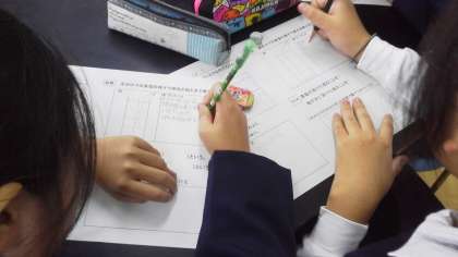 次はいよいよ実験です。最初は食塩を一粒入れて、変化する様子を観察しました。一つまみ、少し多めと何回も食塩を入れ様子を観察し、絵や文で記録します。子どもたちは、大変意欲的に、じっくり、何度も観察し、自分の意見を表現し、食塩がとける様子を「線みたいなものが出てとけた」「流星のように流れて消えた」「最後ぐねぐねしながらとけた」などと発表していました。