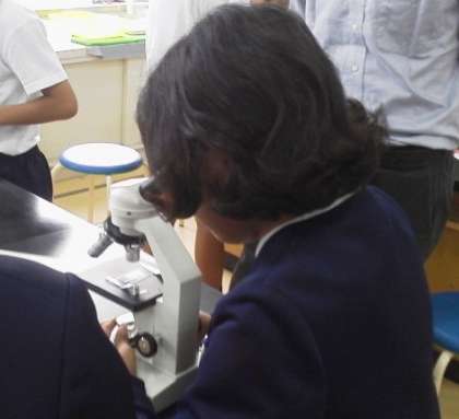 子どもたちは、食塩を顕微鏡で観察し、結晶の形や色について観察した後「食塩は水にどのようにとけるのだろうか」という今日のテーマに取り組みました。