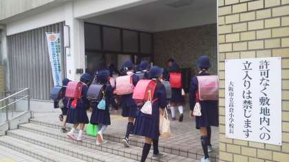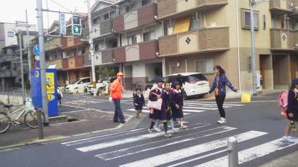 通学路では、オレンジ隊やPTAの方が見守り、挨拶をしてくださいます。正門では本校教職員や学生ボランティアの先生も挨拶をしながら子どもたちを迎えています。