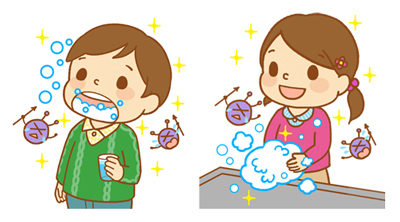 ○手洗いが大切です。外出先からの帰宅時や調理の前後、食事前などにこまめに石けんやアルコール消毒液などで手を洗ってください。