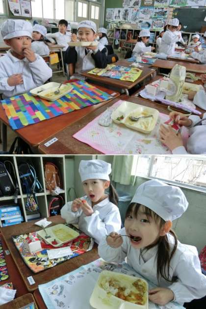 日頃からニコニコ笑顔で給食の感想を報告してくれる児童が多くいる1年生の教室で・・・