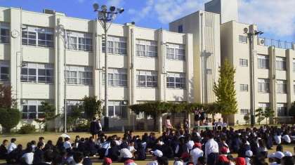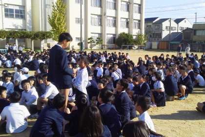 美しい青空のもと全校児童が運動場にキッズファミリー班(1年から6年までの縦割り班)に分かれて集合し児童集会がはじまりました。
