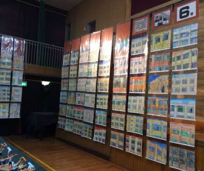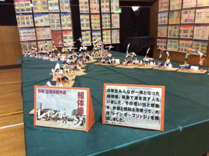 6年生の平面作品は「思い出の校舎」です。6年間を過ごした校舎を写生しました。立体作品は、粘土で組体操のレインボーブリッジを再現しました。