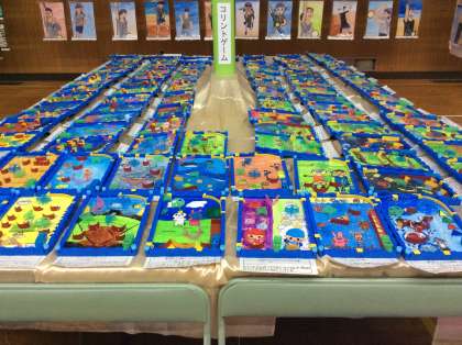 4年生の平面作品は、「エイサー」です。運動会の団体演技の様子を表現しました。立体作品は「コリントゲーム」です。釘の位置を考え、それぞれが工夫したカラフルな作品になりました。