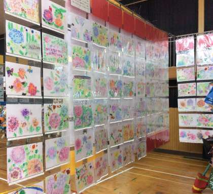 1年生の平面作品は、「あじさい」と「とびだせクラッカー」「ひまわりと小人たち」です。「あじさい」は丸や四角、ちょうの形に切った紙を貼ったり、パスで色を置き中に向かってこすり出したりして表現しました。「とびだせクラッカー」はパスで線を書いたり、折り紙を細かく切って貼ったりして表現しました。「ひまわりと小人たち」はひまわりの周りで楽しく遊ぶ小人たちの様子をパスで表現しました。