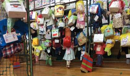 立体作品は「たかくらコレクション」です。紙の手提げ袋で頭の部分を作り、胴体や手足をストッキングや新聞紙を活用して作った大きな人形に服を着せ、とても楽しいファッションショーになりました。