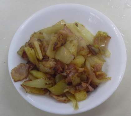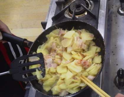 茹で上がったジャガイモを切ってフライパンに加えベーコンや玉ねぎといため、塩コショウで味付けをします。