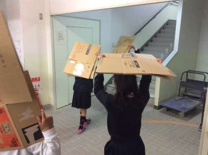 持ち物を確認している班や、はやくも段ボールを確保し、製作に入っている班など様々です。