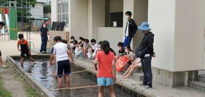 本校においては、例年5年生が社会科の授業の一環として田植え体験を行っています。正面玄関から入ってすぐ右側にある小さな田んぼですが、それでも秋には、全員が自分たちで育てたお米を味わうことができるくらいの収穫があります。