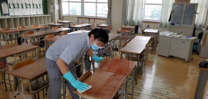 子どもが帰った後、毎日教室やトイレなど、掃除をしたり消毒作業をしたりしています。この消毒作業は、来週15日以降も継続して行います。みんなでがんばって少しでも様々な活動が安心して行える日々を取り戻すことができるようにしたいと思います。