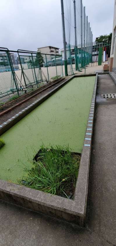 先日、5年生が田植えをするために耕した田んぼですが、今はご覧のように一面緑の浮草に埋め尽くされています。この小さな浮草の名前は、なんとそのものズバリ「ウキクサ」と言います。厳密にはウキクサにも様々な種類があるようですが、いずれも秋の終わりくらいになると越冬芽を作り、冬越しをします。そして田んぼに水が張られると、このように芽を出し、葉を広げます。