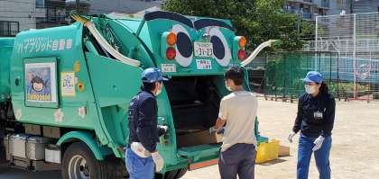 ごみの収集の仕方やパッカー車の仕組みなどについて教えていただいた後、実際にゴミを捨てて、パッカー車を操作させていただきました。
