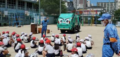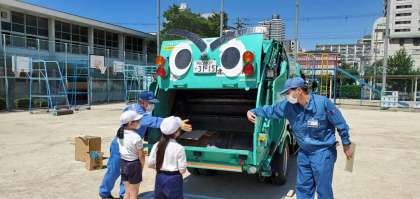 今日の2時限目、大阪市環境事業センターの方にお越しいただき、4年生がパッカー車体験を行いました。