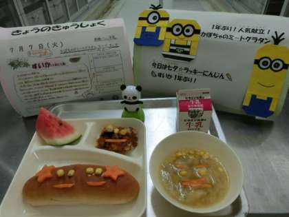 今日のメニューは「かぼちゃのミートグラタン(年1回)、ス—プ(☆型のラッキーにんじん入り)、すいか(年1回)、黒糖パン、牛乳」でした。