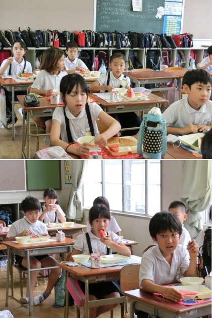 かぼちゃのミートグラタン、ラッキーにんじん、すいかに大盛り上がりの3年生の教室で・・・