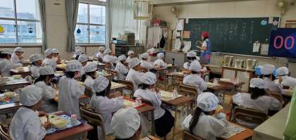 写真は最近の1年生の給食時間の様子です。はじめの頃は6年生のお兄ちゃん、お姉ちゃんに運搬や配膳のお手伝いをしてもらっていましたが、だんだんと自分たちでできるようになってきました。