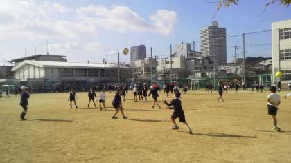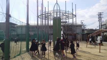運動場では、ボールを使っている子、一輪車や遊具を使っている子などが見られます。