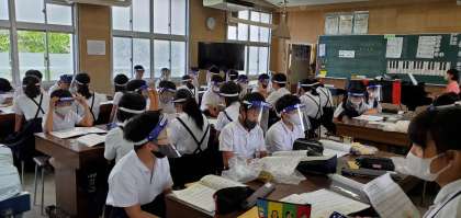 歌も今は音楽室では大声で歌うことができません。なのでご覧のようにフェイスシールドを使うなどして、小さめの声で練習しています。