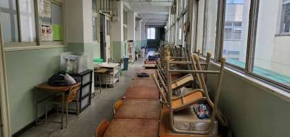 ご覧いただいているのは、放課後の2年生の廊下の様子です。教室の床をワックスがけするために机やいすを廊下に出しています。どの学年も2学期のスタートが気持ちよく行えるよう準備しています。