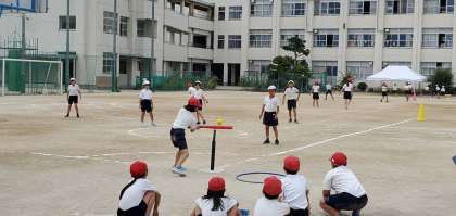 今日の5時間目の体育の様子です。上の写真は3年生が野球型のゲーム「ティーベースボール」をしている様子です。止まっているボールでもなかなかバットに当てるのが難しい子もいますが、お互いに教え合いながらゲームを楽しんでいます。