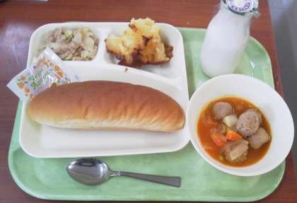 今日のメニューは、ミートボールと野菜のケチャップ煮、ツナとキャベツのソテー、りんごのクラフティ、パン、あんずジャム、牛乳です。