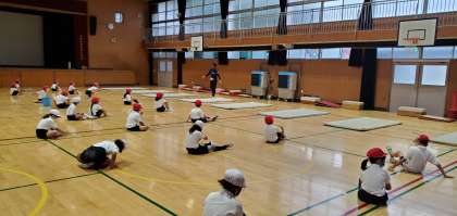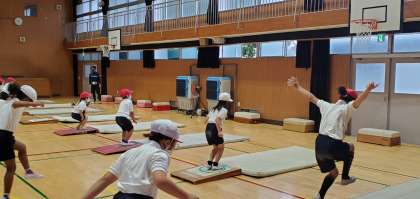 午前中は、1年生がクラスごとに跳び箱運動やマット運動につながるような感覚づくりの運動を教えていただきました。