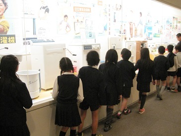江戸時代の次は、明治大正昭和の大阪です。当時の街並みのジオラマや天神祭のジオラマを見学しました。「昭和のレトロ家電展」が開かれていて、昭和30年代のテレビや冷蔵庫、手回し脱水装置のついた洗濯機などが当時のコマーシャルポスター等といっしょに展示されていました。ちょうど今、社会で学習しているところなので、どの子も、実物を熱心に見学していました。