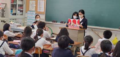 写真は朝の会の時間の様子です。図書委員会の児童が下の学年の子どもたちの教室で絵本の読み聞かせをしてくれています。
